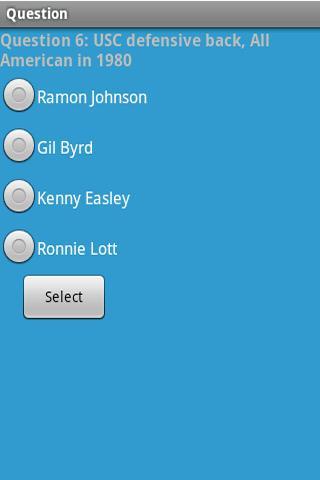 College Football History and Statistics ist eine Quizformatanwendung, um Ihr Wissen über NCAA College Football History zu testen. Der Benutzer kann zwischen 10, 25 oder 100 Fragen und einem einfachen oder Standard -Schwierigkeitsgrad auswählen. Bei Fragen geht es um Spielrekorde, Saisonrekorde, großartige Auftritte, Spitznamen und mehr.